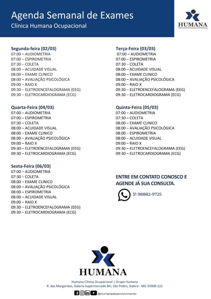 A Humana Ocupacional, localizada em Itabira (MG), oferece soluções completas em saúde ocupacional e gestão de pessoas para empresas. Com estrutura própria para exames médicos e serviços de recrutamento e seleção, a empresa garante agilidade, conformidade legal e redução de custos. Tudo é feito em um só lugar — desde consultas admissionais até laudos exigidos pelo eSocial …